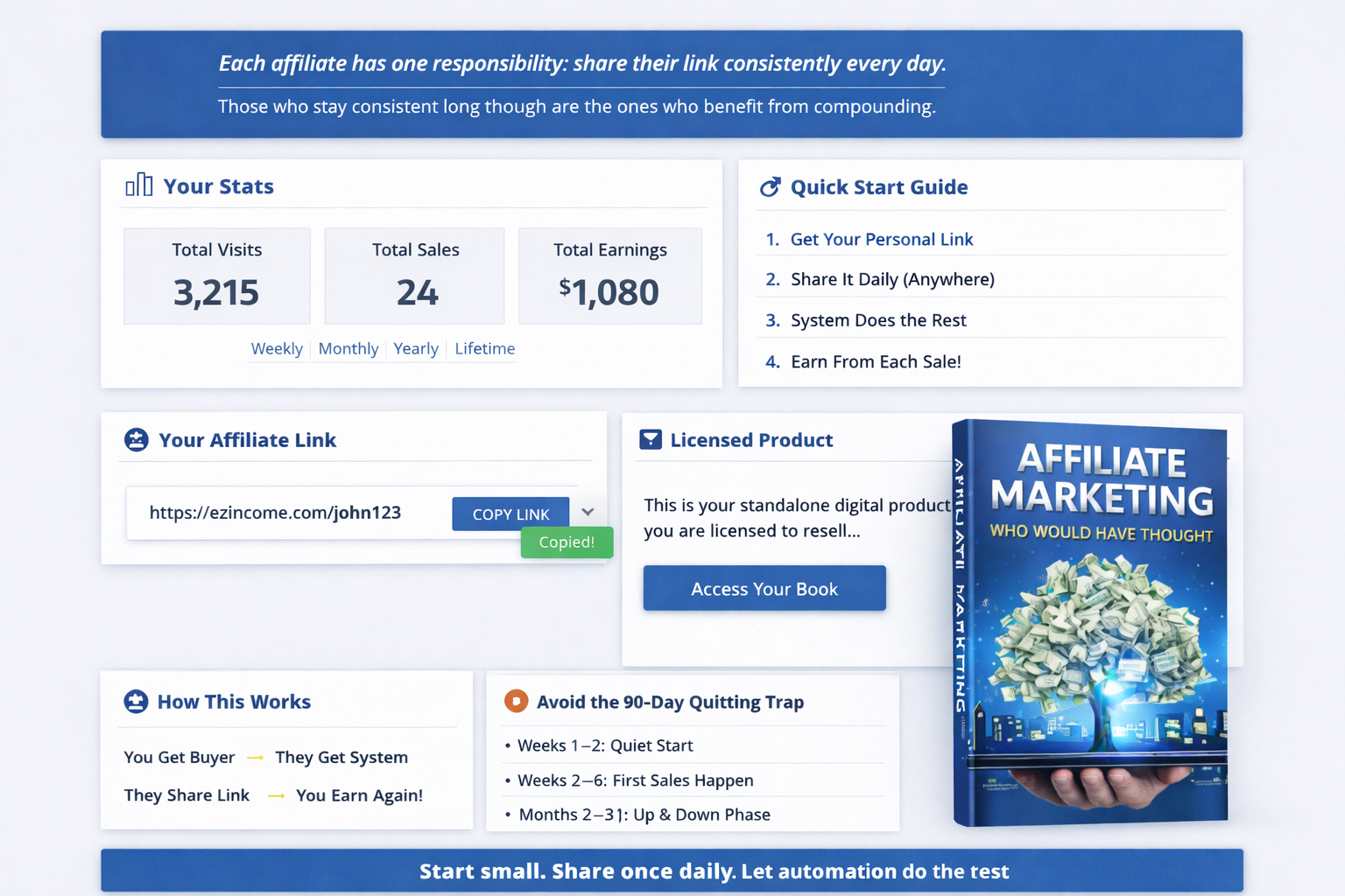 EZIncome gives you a real digital product, your personal tracking link, a simple dashboard, and beginner-friendly step-by-step instructions so you can start sharing with confidence.